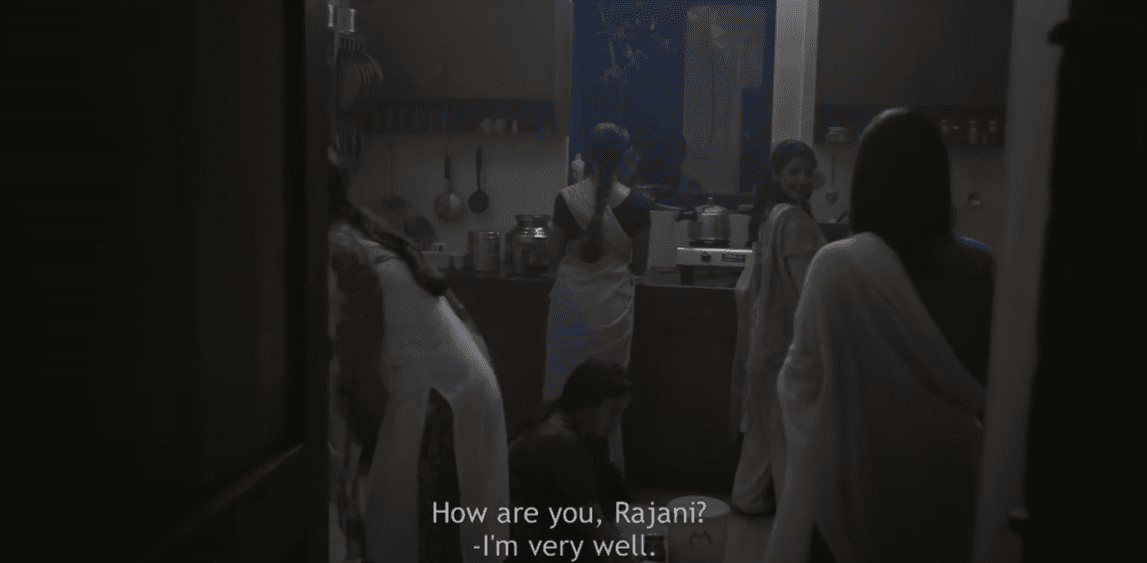 The short film Juice is peppered with similar interactions that comment on unseen labour and care work, particularly associated with cooking. This is seen especially in the film’s depiction of gender-based divisions of space within the home. In a hot kitchen with one working fan, wives prepare dinner while husbands relax in the air-conditioned living room with drinks and snacks. "Not like she's got a lot of work at home. At least here she can be an extra hand in the kitchen," a male character remarks, revealing how women's labor at home remains unrecognized and how they are denied respite from gendered expectations even as guests.